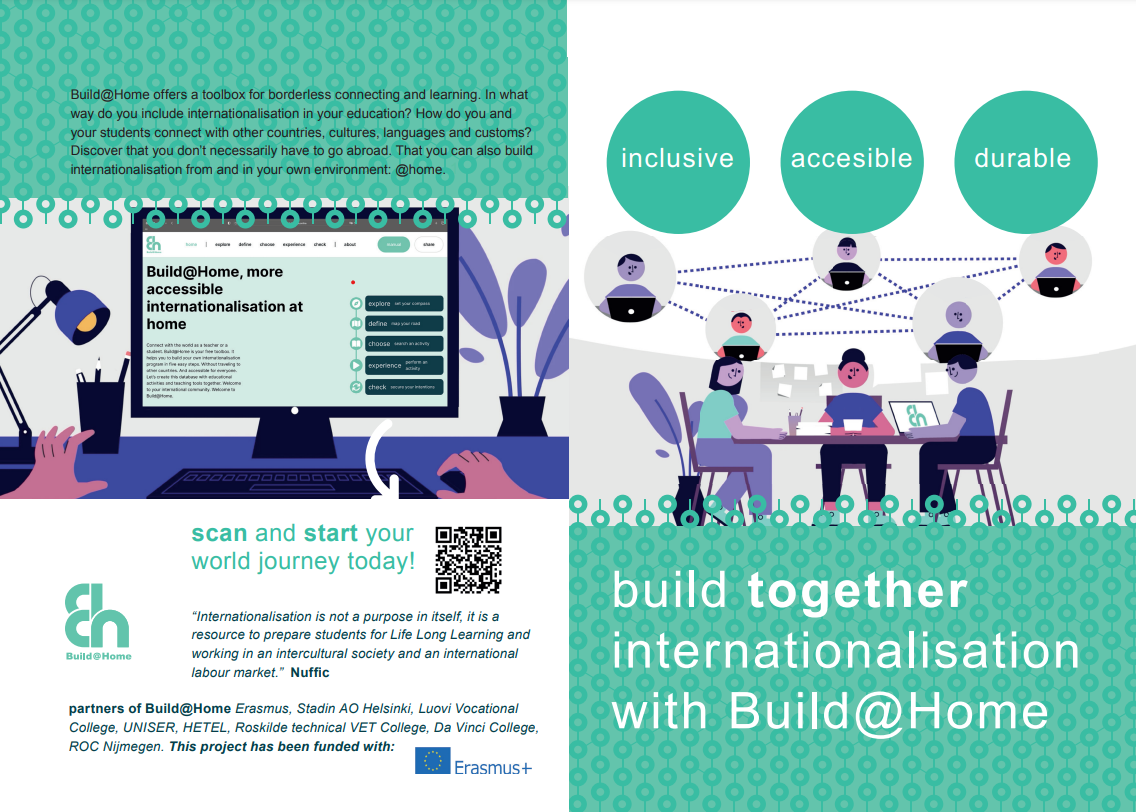 BUILD@HOME produced intellectual outputs free of charge and available to anyone who wishes to use them. With them, we intend to contribute to maximizing the impact of our work, offering resources and solutions to VET centers that wish to develop their own internationalisation strategy and need support to implement it, from a strategic level to an operational level.